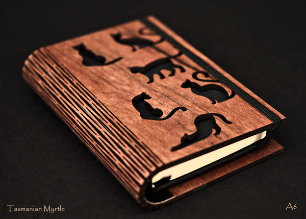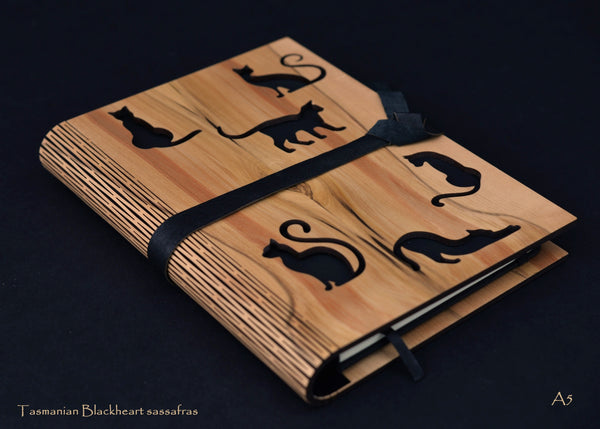 Tasmanian Timber notebook cover  featured here using our beautiful Tasmanian Timbers  . Comes with a removable A5 hard cover book for the large and an A6 for the small which can be easily removed and replaced.  These notebooks are made from one piece of Tasmanian Timber Veneer and are laser cut to form a flexible spine, which has binding on the inside. The large notebook comes with a leather strap. Our products are all finished with a 2- pack finish making them water resistant.