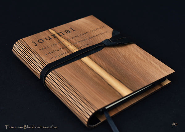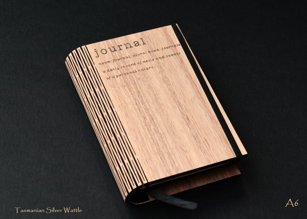 Tasmanian made notebook cover featured here using our beautiful Tasmanian Timbers . Comes with a removable A5 hard cover book for the large and an A6 for the small which can be easily removed and replaced.  These notebooks are made from one piece of Tasmanian Timber Veneer and are laser cut to form a flexible spine, which has binding on the inside. The large notebook comes with  a leather strap . Our products are all finished with a 2- pack finish making them water resistant.