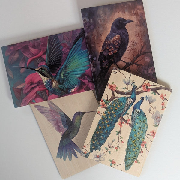 These wooden cards can be used for postcards ,  cards or  framed up into one of our standard size frames or a purchased generic frame. They measure 10.5 x 15.5 cm  and are made from Tasmanian Oak veneer. They come with a recycled paper envelope and packaged in a clear bag.