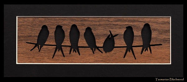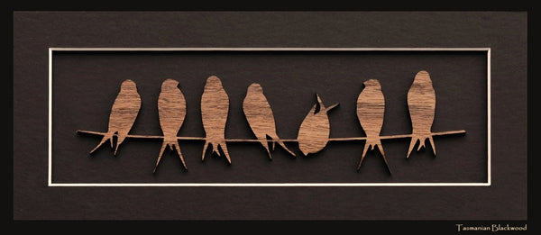 Tasmanian Timber decorative panel. Ready to frame bird on a wire panel. Each unframed panel is made from our wonderful Tasmanian Timber Veneers with 7 different timbers to choose from. Each panel comes in either a solid silhouette or a cut out design . There is a laminated species card on the back with information about the timber featured in the panel. Like all our products it is made by us in our workshop in Hobart.