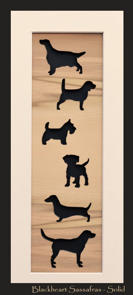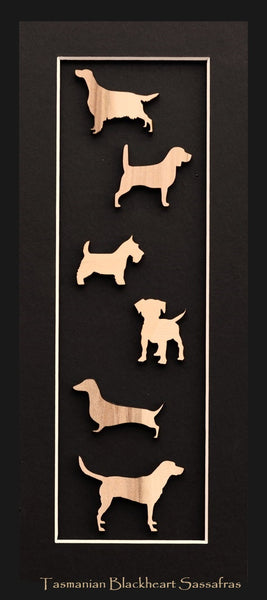 Tasmanian Timber decorative panel. Ready to frame dog panel featuring our wonderful Tasmanian Timbers. These unframed panels come in a solid silhouette or cut out . There is a laminated species card on the back of each panel with information about the timber featured in the panel.   Like all of our products they are created by us in our Hobart workshop.