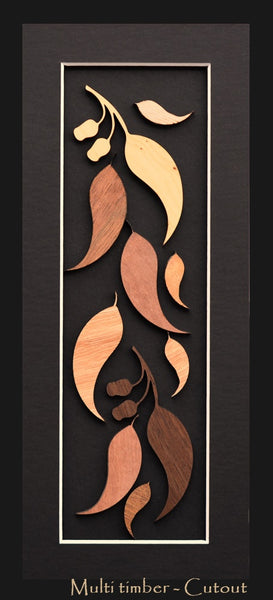 Tasmanian Timber decorative panel. These ready to frame multi timbered gum panels are all put together by hand, giving each one a unique look. Each unframed panel comes with a mixture of 4 timbers. On the back of the panel is 4 laminated species cards with information about the timber used. Like all of our products they are made in by us in our Hobart workshop.