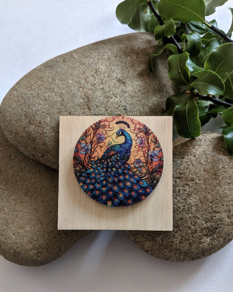 Our timber brooches are made from Tasmanian Timber Veneer. All brooches are printed on Tasmanian Oak. Colours, patterns and designs may vary from photos. Brooches come mounted on Tasmanian Oak Veneer display card. Brooch measures 47mmx47mm.
